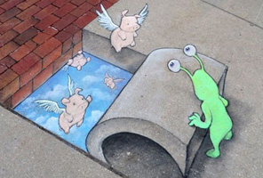 دیوید زین david zinn هنرمند خودآموخته ای هست که با استفاده از گچ و زغال اقدام به آفرینش نقاشیهای خیابانی استریت آرت کرده که به زیبایی با محل نقاشی مناسبت پیدا کرده. این هنرمند تصویرسازیهای بامزهی خودش را برای نخستین بار در سال ۲۰۰۱ و در خیابانهای آن آربور که زادگاه دانشگاه میشیگان و یک حوزهی هنری پررونق هست ترسیم کرد. زین تمام نقاشیهای خلاقانهاش رو در همون جایی که رسمشون کرده الهام گرفته. شخصیتهای دوستداشتنی مثل اسلاگو که یه هیولای بامزه است و فیلومنا که یک خوک پرنده است با ترکهای پیادهروها٬ درزهای آجرها٬ چراغهای خیابانها و گلدانها ارتباط بینظیری برقرار کرده و حالت سه بعدی بینظیری را ایجاد کرده.