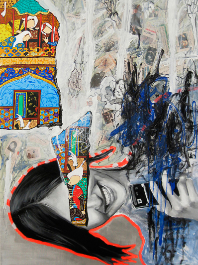 به دو دلیل از مینیاتورهای قدیمی ایرانی در آثارم استفاده کردم. اول اینکه به لحاظ بصری، چیدمان رنگ در مینیاتورها بسیار ماهرانه و زیبا بود و من به عنوان یک تصویر و عنصر “حاضر آماده” از اونها استفاده کردم. دلیل دوم این بود که عموما در مینیاتورهای ایرانی، مردم و جامعه ایران به تصویر کشیده میشن و این موضوع ابزار مناسبی رو برای نقد و تحلیل بصری جامعه و محیط پیرامون به من میداد.