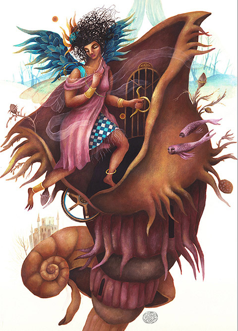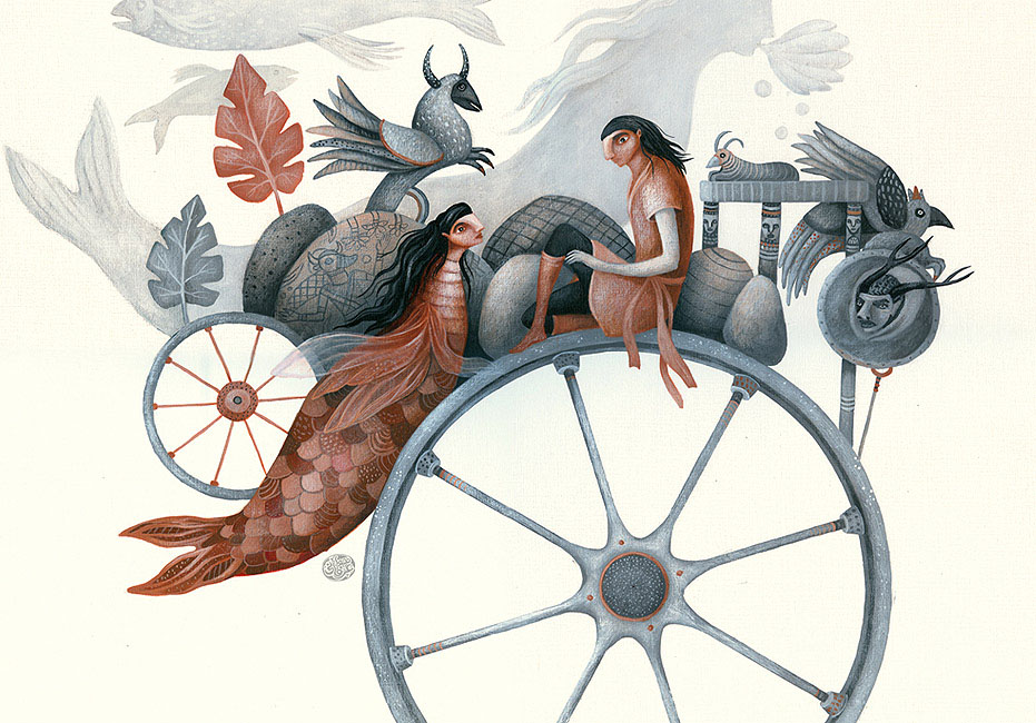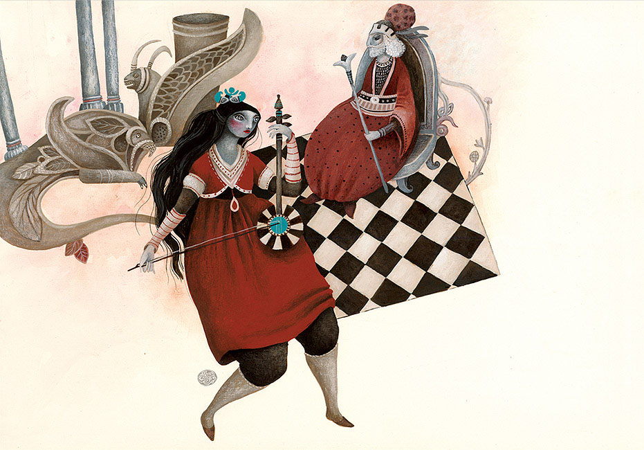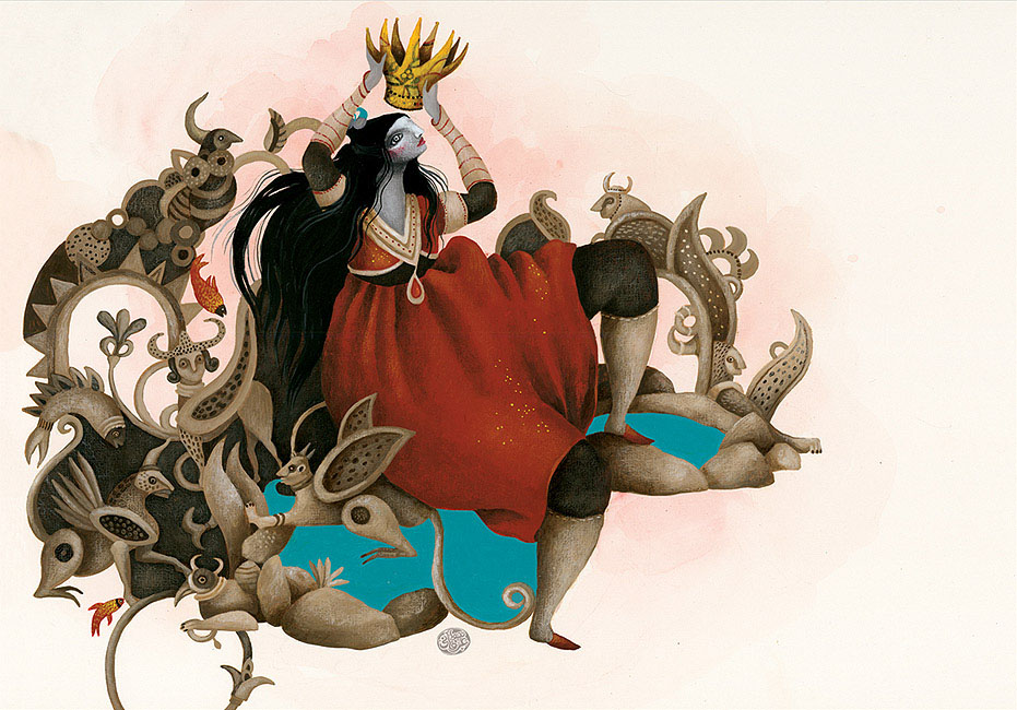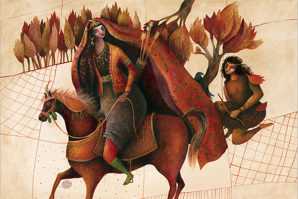 داستان ها و فضاهایی که همیشه مرا جذب خود کرده و در حیطه کار تصویرگری به آن سمت کشیده شده ام، افسانه ها و اسطوره ها بودن که به نوعی بی زمانی و بی مکانی رو نقل میکنن. چه هزار سال پیش و چه عصر حاضر، دختر نارنج و ترنج در بالای درختی در ناکجا آباد طلسم دیو شده و یا ایزدبانویی به قصد فتح دنیای زیرین، زره به تن میکنه.