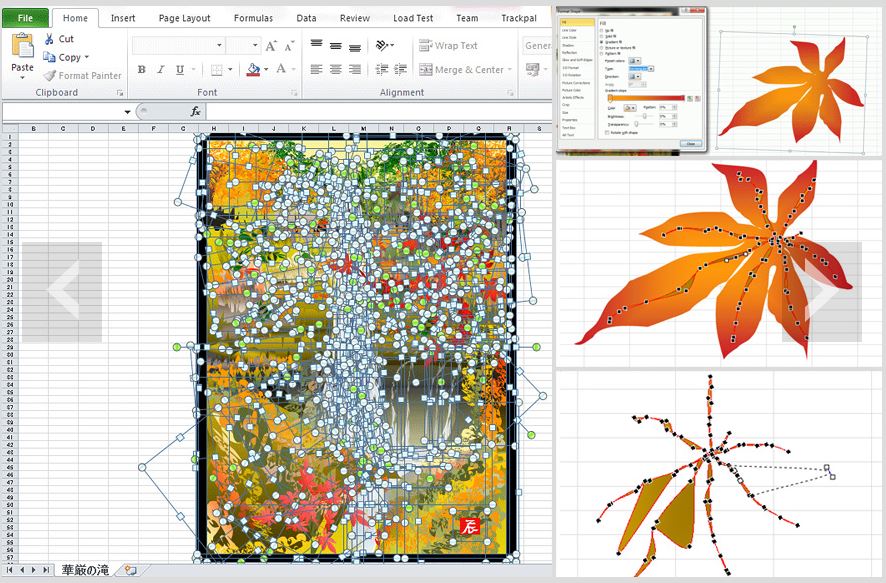 Tatsuo Horiuchi پیرمردی ژاپنی هست که علاقه بسیار زیادی به فرهنگ خاور دور، ژاپن و چین داره و به عنوان سرگرمی شروع به خلق آثاری کرده که در نوع خودش جذابیت های خاصی رو داره. اما نکته جالب این هست که این آقا بخاطر گرون بودن نرم افزار و ناتوانی در خرید برنامه های خاصی مثل ایلاستریتور یا کورل دراو، آثار خودش رو با برنامه EXCEL ایجاد کرده. در این برنامه چند ابزار ساده گرافیکی وجود داره که کاربر میتونه گره ها و رنگهای ساده ای رو برای نمودارها ایجاد کنه، اما این هنرمند تونسته با صرف زمان بیشتر کارهای ویژه ای رو ارایه کنه. Tatsuo در حدود سیزده سال هست که به طراحی نقاشی دیجیتال مشغول هست.